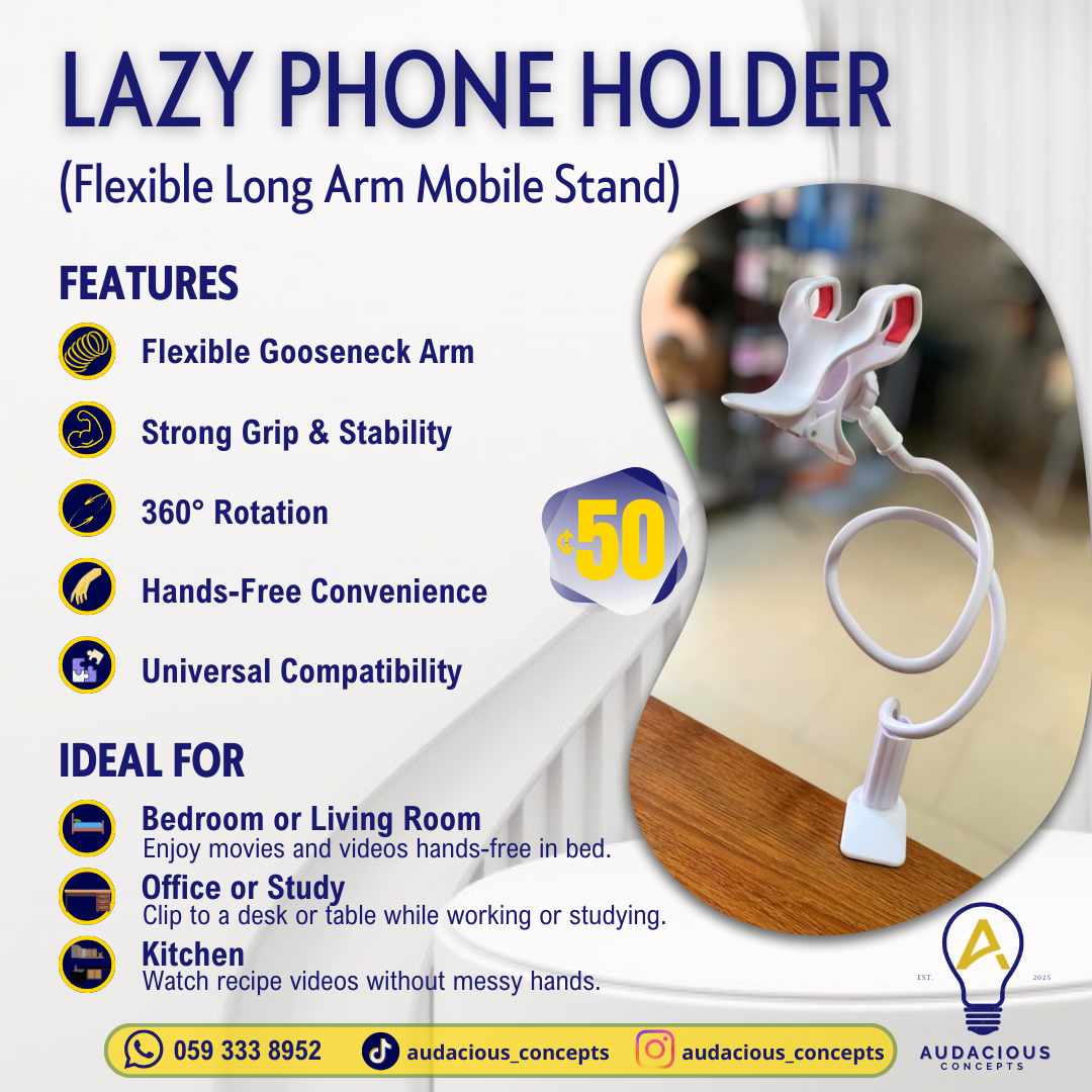 Flexible long-arm phone holder with sturdy grip, 360° rotation, hands-free use, and universal device compatibility.